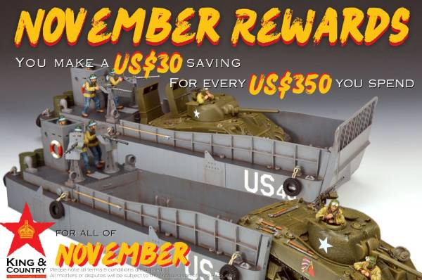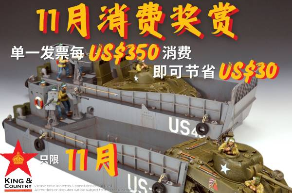 凡国内兵人收藏爱好者于 King & Country 网店购物,單一订单每US$350消费,可享US$30 即时扣减。