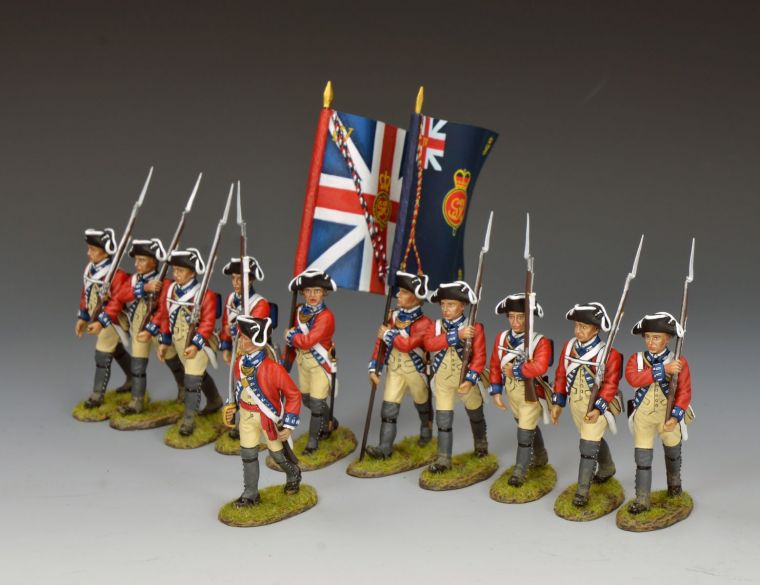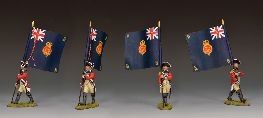On the opposite side of this Revolutionary War battle the order is given for the 4th Regiment of Foot’s colours to be brought forward to the front of the long red line of advancing British infantrymen marching towards the enemy.| BR104 “4TH Regiment of Foot Officer w/The King’s Colour” Beginning in 1743 it was decreed by King George Ⅱthat each British Infantry Regiment was to have as their ‘first colour’ (flag/standard) the ‘King’s Colour’ which would be a large ‘Union Jack’ as a symbol of royal allegiance. In addition in the centre of the Union Jack would be the regimental crest, in this case the monogram of the reigning Monarch (GeorgeⅢ)surmounted by a crown. Also added at this time was the number of the regiment, the latin numerals IV”, in the upper canton denoting the 4th Regiment of Foot. Over time selected battle honours were also added to the King’s Colour however at the time of the Revolutionary War the flag remained relatively unadorned except as shown. It was normal at this time for the flag to be carried by a junior company officer, usually a lieutenant. |