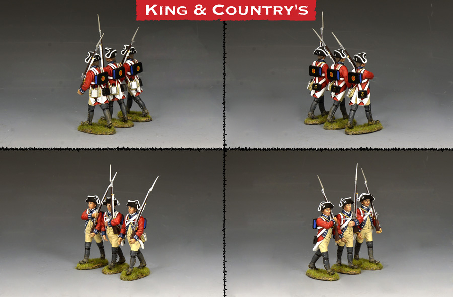 | BR107 “Marching Redcoats” (Set of 3) A trio of soldiers from the 4th Foot. All are holding their ‘Brown Bess’ muskets in slightly different ‘shoulder-arms’ positions. These three figures look great together or in larger numbers to form a regimental or company advance… |