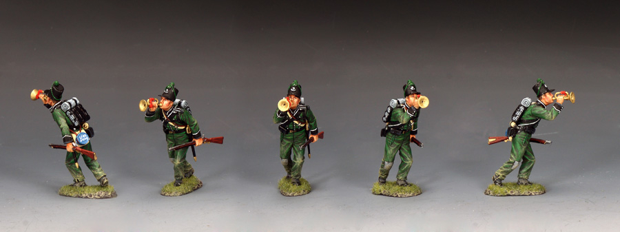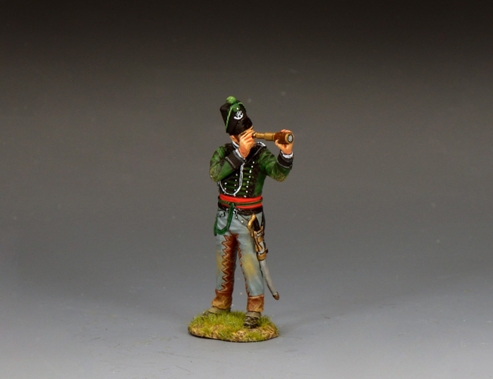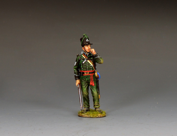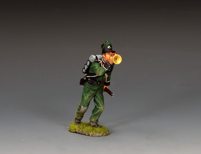 | NA557 “95th Rifles Bugler” The Buglers of the 95th were key figures in the regiment responsible for relaying commands on the battlefield using their bugles. Their primary role was to communicate orders to the widely dispersed riflemen, who operated as advance guards, scouts and skirmishers. This was in stark contrast to the massed formations of more traditional infantry regiments. |