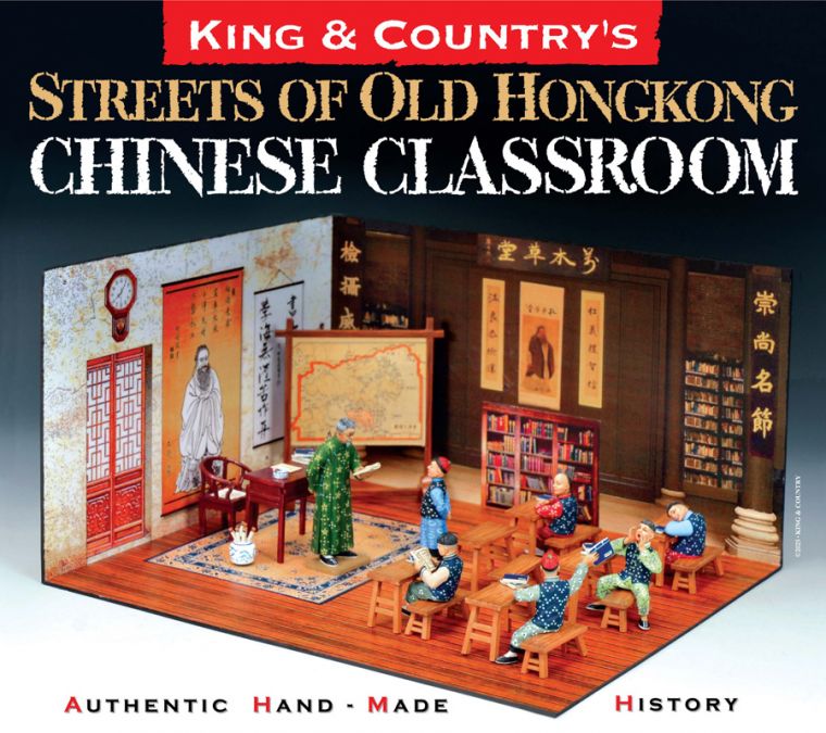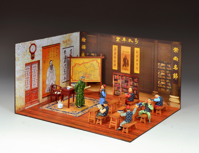 | HK315(G/M) “The Chinese Classroom” This little scene depicts one of the many private schools established during the latter part of the 19th Century for the sons of gentle folk in Colonial Hong Kong. As the elderly teacher examines the work of one pupil other pupils are variously occupied being mischievous, paying attention or, in one case, enojoying a nap on his desk! In addition to the 7 figures there are 6 desks and bench-seats for the pupils as well as a teacher’s table and chair, a jarfull of scrolls and a large wooden map board depicting Hong Kong Island. All of the figures and accessories fit perfectly into a 2-dimensional, full colour representation of a typical Chinese Classroom of the 1890s. |